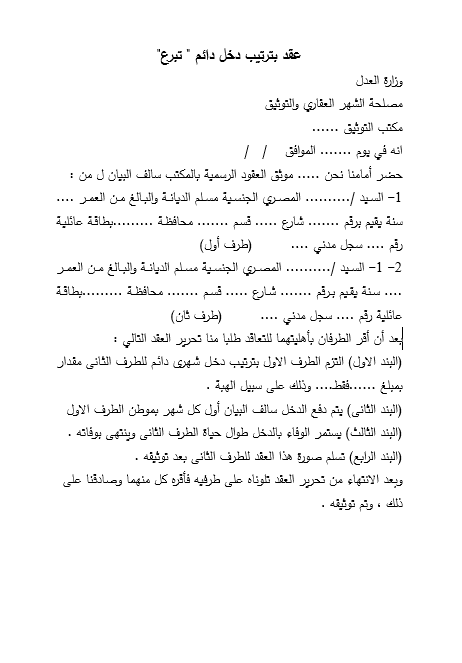 صيغة عقد بترتيب دخل دائم - تبرع