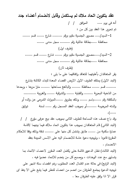 صيغة عقد بتكوين اتحاد ملاك لم يستكمل وقابل لانضمام أعضاء جدد
