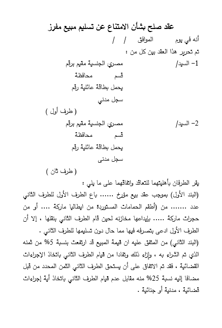 صيغة عقد صلح بشأن الامتناع عن تسليم مبيع مفرز