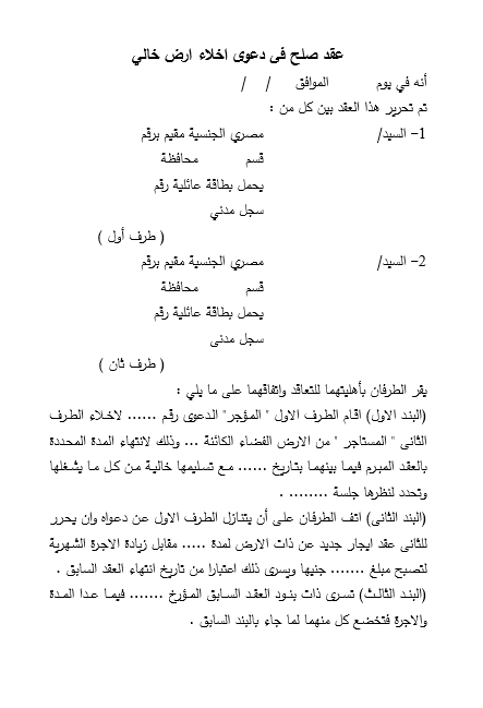 صيغة عقد صلح فى دعوى اخلاء ارض خالي
