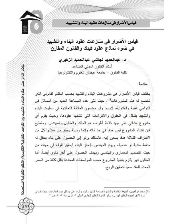 قياس الأضرار في منازعات عقود البناء والتشييد في ضوء عقود الفيديك